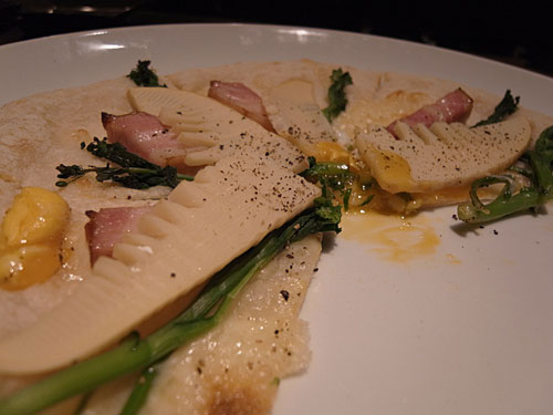 卵黄とたけのこと菜の花の、とても美味しいピザでした。