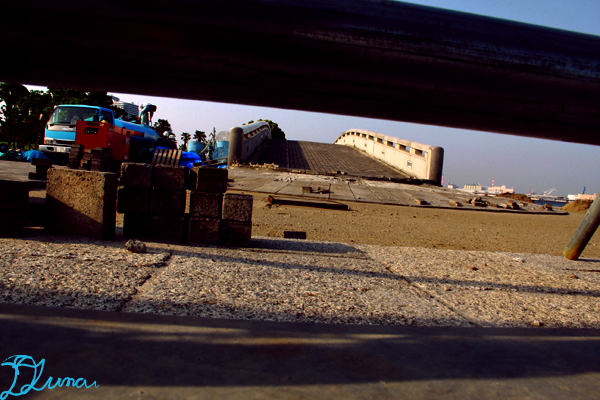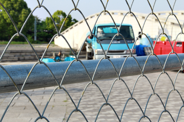 フェンスの下から遠くに見えるは、作り直されている橋。